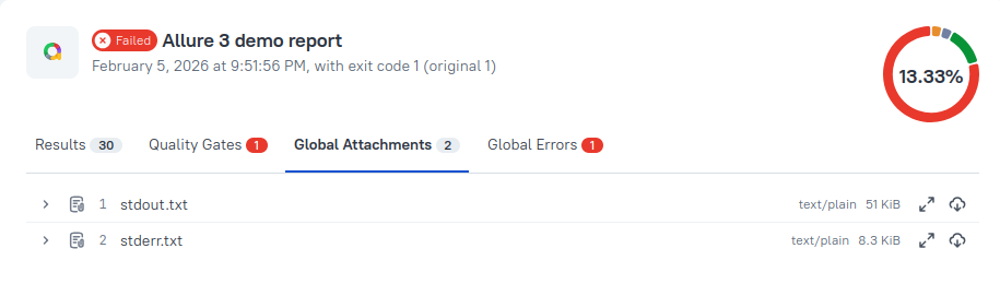 Starting with Allure Report 3, you can capture process-level information about your test runs, such as stdout and stderr outputs, test process errors and exit codes, and attach them to your test reports.
