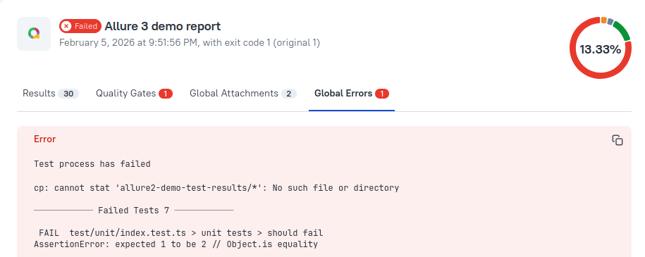 --ignore-logsoption to turn off global errors and attachments does not affect quality gates operation, and does not hide failed quality gates in the report.Multistage reports list all global errors and all global attachments from all stages included in the report.